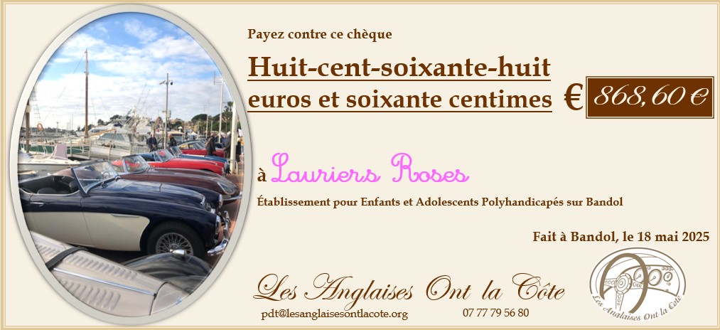 En 2023, vous avez ainsi permis un don de mille-vingt-deux euros et cinquante centimes, que notre président a remis directement à la présidente de l’association Les Lauriers Roses lors de la manifestation du 02 juin 2024. En 2024, vous avez permis un don de huit-cent-soixante-huit euros et soixante centimes. Nous vous en remercions chaleureusement et comptons sur votre générosité l’an prochain !
